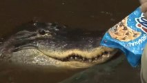 En Louisiane, un guide d’excursion d'Airboat Adventures a sauté dans un bayou pour nourrir des alligators directement dans leur gueule avec des morceaux de poulet et du chamallow !