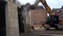 De sloop van de schoorsteen van de voormalige zuivelfabriek in Ezinge is dinsdagmorgen begonnen. De fabriekspijp moet tegen de vlakte omdat deze volgens de gemeente Winsum een gevaar oplevert voor de omgeving. Zo vielen er geregeld stenen naar beneden.