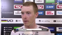 La réaction de Rohan Dennis après son contre-la-montre des Championnats du Monde de Ponferrada. L'Australien, qui était monté dimanche dernier sur la plus haute marche du podium avec son équipe BMC, vainqueur du chrono' par équipes, prend, ce mercredi, la cinquième place, à moins d'une minute de Bradley Wiggins.