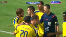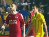 A la 33e minute du chaud derby de Tel Aviv, alors que Eran Zahavi vient d’égaliser sur penalty pour le Maccabi, un spectateur de l’Hapoël débarque sur la pelouse, non pas pour se balader les fesses à l’air, mais carrément pour agresser le joueur, ancien du club (champion en 2010), désormais passé chez l’ennemi après son échec européen à Palerme. Pas impressionné, Zahavi se défend et l’ensemble de la pelouse se joint à son effort, rendant la scène des plus chaotiques.