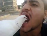 woow pigen eating from mouth of a boy