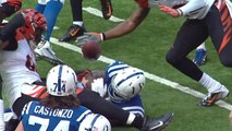 Cincinnati Bengals quarterback Andy Dalton is sacked and fumbles. The ball is recovered by Colts defensive tackle Montori Hughes.
