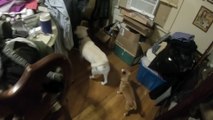 Four dogs waiting for dad to feed them food