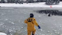 Buz tutan gölde boğulmakta olan köpeği böyle kurtardı