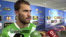 Wolfsburg striker Bas Dost has praised his side's defence as they claimed a 2-0 win over Sporting Lisbon in the first leg of their Europa League round of 32 tie.