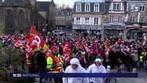 Environ 1.200 personnes ont selon la police manifesté mercredi 4 mars à Villedieu-les-Poêles (Manche), pour soutenir les salariés de l'abattoir AIM qui emploie plus de 350 personnes mais menace de fermer. La commune est devenue ville morte pendant plus de deux heures. Durée: 01:54