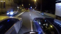 Motorcycle Tries To Pass Between Two Cars