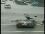 Una cámara de seguridad captó este aparatoso accidente en la ciudad rusa de Sochi: un coche Range Rover Evoque que circulaba a toda velocidad pierde el control en un tramo resbaladizo, choca y sale despedido violentamente de la autopista. Un transeúnte que fue testigo de la tragedia acude ayudar a las personas accidentadas, abre la puerta del auto destrozado y el conductor sale del vehículo siniestrado por su propio pie.
