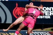 Chris Hala'ufia sèche un streaker pendant un match de Leicester
