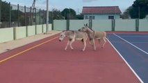 Two donkeys run into a basketball court and interrupt the game