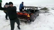 Jeter une voiture en feu dans un lac gelé