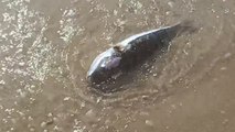 Fish fights hard to return to water until a wave stops the drama