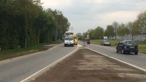 Le convoi exceptionnel SPX pour l'usine de lait de Carhaix a quitté ce matin Glomel pour rejoindre en début d'après-midi Plévin puis Carhaix. Fin de matinée, le convoi s'arrête au carrefour de la D3 et de la D 83 pour une pose casse-croûte.
