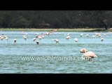 Great white Pelican take flight at Thol Lake. Thol Sanctuary, about an hour's drive from Ahmedabad, attracts flocks of flamingos, pelicans, kingfishers, ibis, and leggy storks.