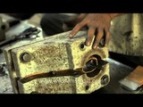 The manufacturing process of the foot. Each craftsperson makes 5 to 6 feet per day. They work a 6 day week and the majority of them are amputees or affected by polio themselves. Various rubber and wooden pieces are used to construct the foot before it is put into a die that gives it the realistic appearance.