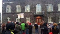 Protester throws a yoghurt at Iceland's parliament building
