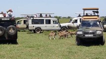 Cheetahs on Safari Vehicle in front of us at Central Serengeti NP.mp4