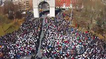 Pillows go flying in Washington Square Park as thousands take part in huge collective pillow fight. Police watch from high vantage points, no arrests or incidents reported