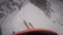 Speedrider skier rides an avalanche off a cliff
