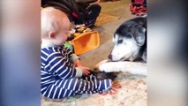 Dogs and babies funny videos Dogs is pulling little kids by his feet Dogs and babies doing funny
