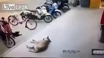 Dozing canine bite back after cruel man kicks it into road