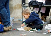 The first 400 migrants arrived on a train into Vienna, where charity workers provided them a battery of supplies displayed in separately labeled shopping carts containing food, water and packages of hygiene products for men and women.