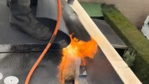 Roofing job takes a funny turn as worker throws broom head into fire to tease coworker