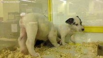 Malgré les efforts de ce petit homme, un bulldog anglais têtu a aucun intérêt de faire une promenade à l'heure actuelle.