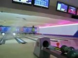 Une femme blonde s'apprête à lancer la boule de bowling mais tout ne se passe pas comme elle l'avait prévu