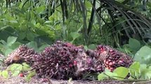 Paysage lunaire au milieu de l'immensité verte, une bande entièrement pelée traverse la jungle, piquée de milliers de jeunes pousses à l'avenir en or: rouge celui-là, comme le fruit du palmier à huile. En Indonésie, l'équivalent de six terrains de football de forêt primaire disparaît chaque minute.