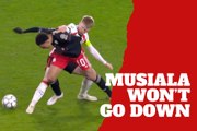 Jamal Musiala refuses to go down after getting tackled by a defender