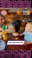 A little boy sits on his colorful scooter in the kitchen and is pushed forward by his Dad. Their little dog runs after the boy and grabs ahold of the chew toy which is attached to the scooter seat. The dog pulls the little boy by the chew toy all the way back to his Dad. While all of this is going on, the little boy giggles incessantly.