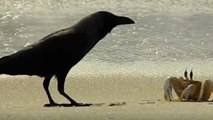 Un face-à-face étonnant entre un corbeau affamé et un crabe filmé sur une plage
