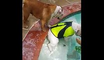 One bulldog is afraid that her brother is going to drown, even though he's wearing a life vest.