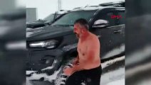 Ankara Beypazarı’nda bir kişi arazide üstünü çıkarıp kar banyosu yaptı