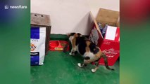 Cat carries mouse over to food bowl so they can dine together