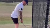 Golf swing gone wrong as player gets hit below the belt by rebounding ball