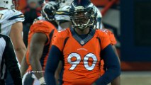 San Diego Chargers quarterback Philip Rivers is intercepted by linebacker Danny Trevathan and he returns it for a 25-yard touchdown.