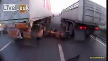 Scooter riders are very lucky! Accident between two trucks