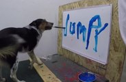 Le dresseur professionnel Omar Von Muller a publié une nouvelle vidéo, le 26 décembre. On peut y voir Jumpy, son chien, réaliser une performance peu commune : à l'aide d'un pinceau et d'un peu de peinture, il va écrire son nom sur un tableau !