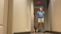 Girl rollerblades with her sisters in a hallway and takes a hilarious fall