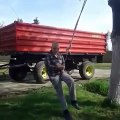 Un homme se prend pour Miley Cyrus assis sur une balançoire. La tête penchée un peu trop en arrière va buter contre le sol. I came like a wrecking ball !