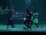 South Korean diver plays football in aquarium