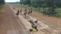 Man attracts the Emus with Leg Cycle in the air