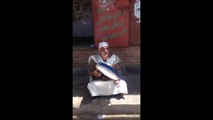 Assis sur un trottoir, un homme essaie tant bien que mal de se protéger d'une rafale de vent avec son tambourin...