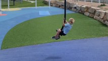 Young boy tries zip line ride on his own but takes a sudden tumble at the end of the track
