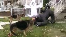 2 German shepherds attacking a Halloween cat