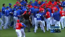 Matt Bush nailed Jose Bautista in the arm on a pitch. It was such a hard hit, but was it intentional? You be the judge, but there’s a lot of bad blood between the two teams. Things escalated quickly from there. Bautista slid aggressively into second base, and we’re guessing Rougned Odor didn’t like it to much. Odor pushed Bautista, then punched Bautista right in the jaw. Benches cleared and all hell broke loose between the two teams. Take a look: