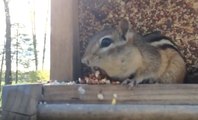 Un homme a pris en flag un tamia en train de voler de la nourriture dans le mangeoire aux oiseaux. Pris la main dans le sac, le petit écureuil va avoir une drôle de réaction et recracher toutes les graines de ses abajoues.