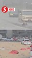Vehicles trapped on Thai road submerged by deep floodwater